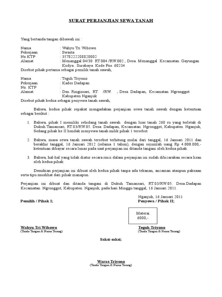 Contoh Surat Perjanjian Sewa Tanah Lamudi Doc